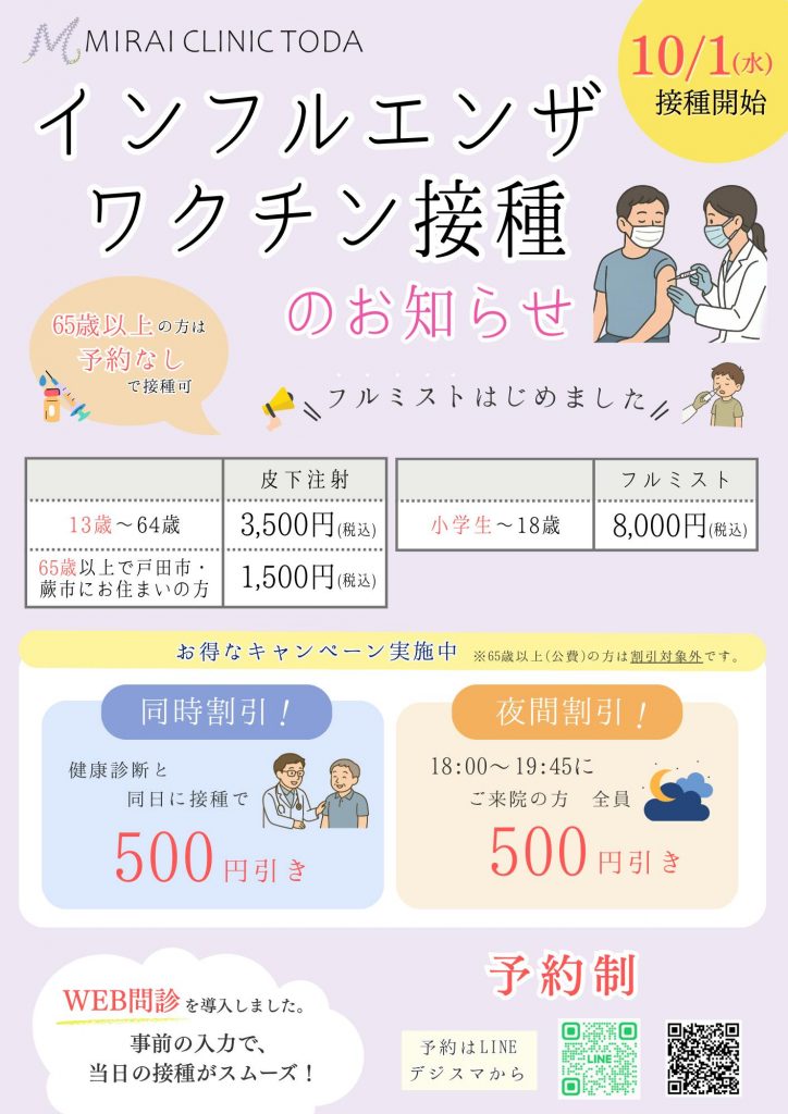 2025年度のインフルエンザワクチン接種が10月1日(水)から始まります。